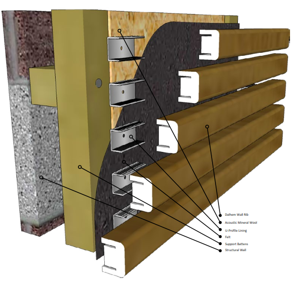 Dalhem Ribba wall ribs are installed using individual clips giving no restriction to external curved installation and leaving the minimum radius for internal curves dependant on both rib depth and spacing between ribs.